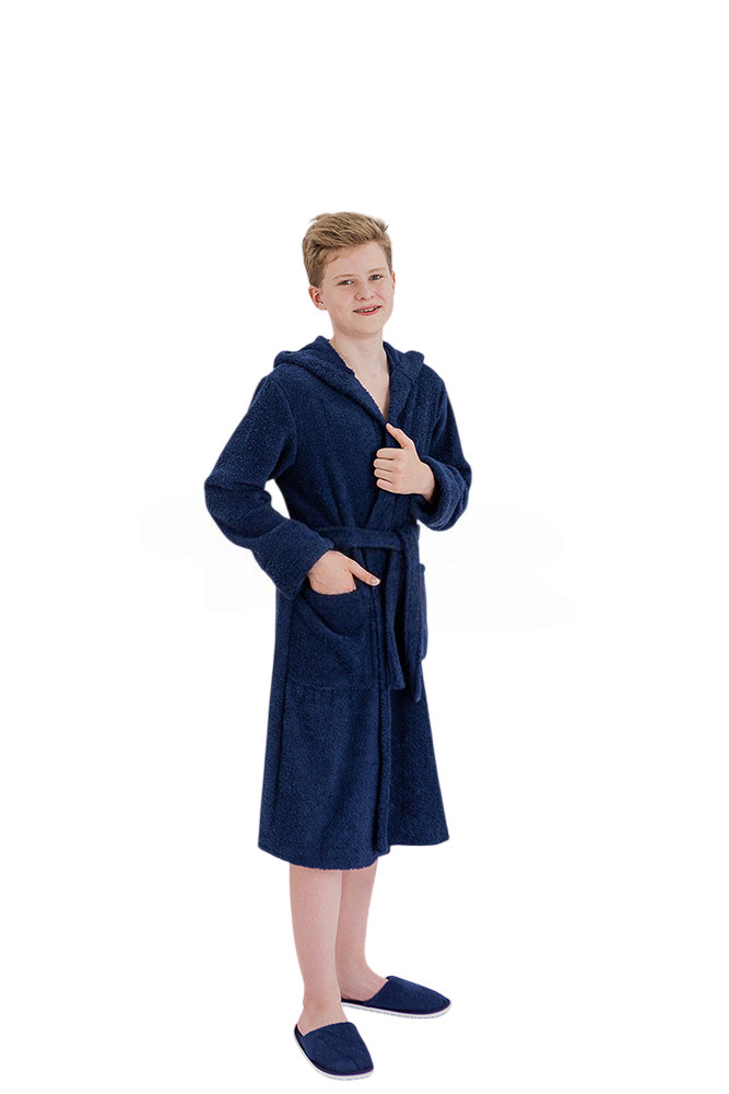Подростковый классический махровый халат с капюшоном (Темно-синий) на сайте имеется разных цветов, материалов и параметров. Купить продукцию не составит большого труда!